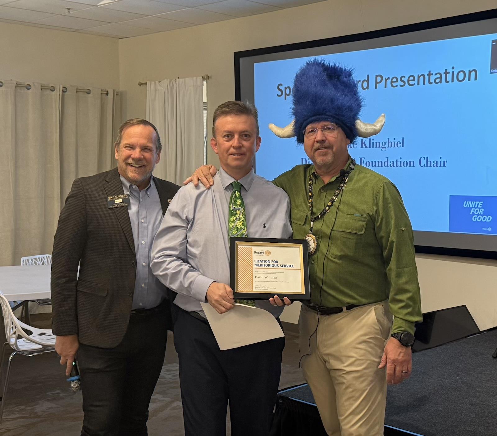 The Centennial Rotary Club is proud to recognize fellow Rotarian David “Willy” Willman for receiving the Rotary Foundation Citation for Meritorious Service, one of the highest honors awarded by Rotary International.